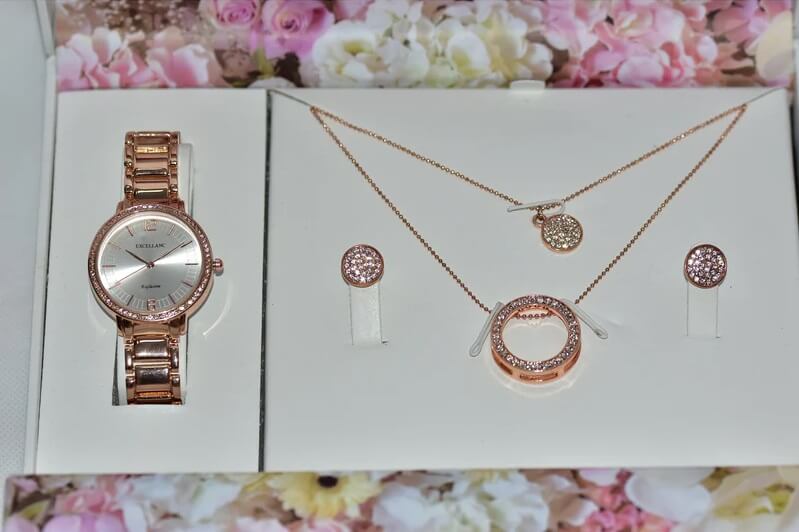 O conjunto é composto por um relógio elegante, um colar duplo e brincos a condizer.